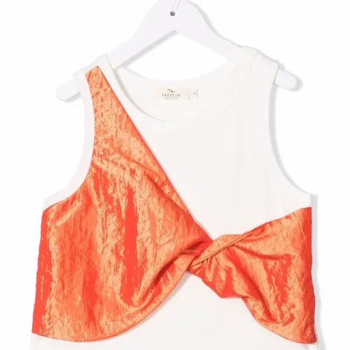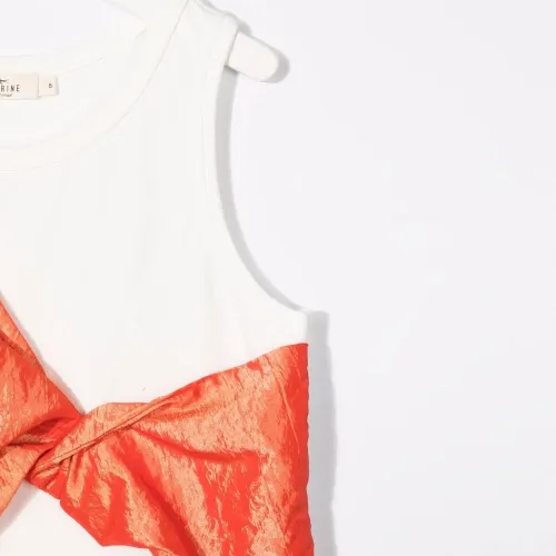 Перекрученная деталь, без рукавов, круглый вырез и прямой подол. .