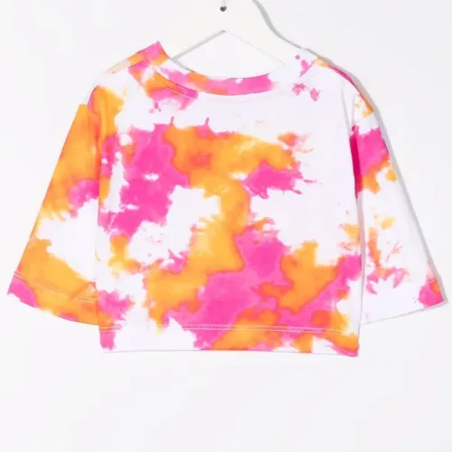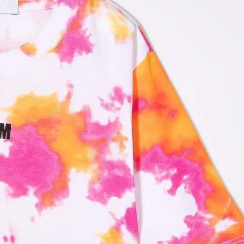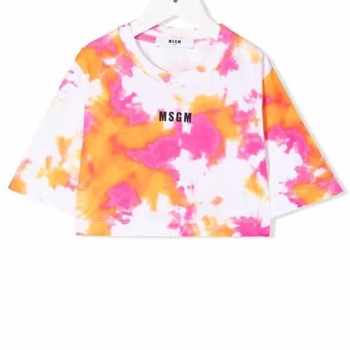 Принт тай-дай, логотип спереди, круглый вырез и короткие рукава.