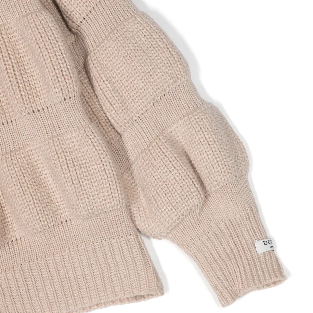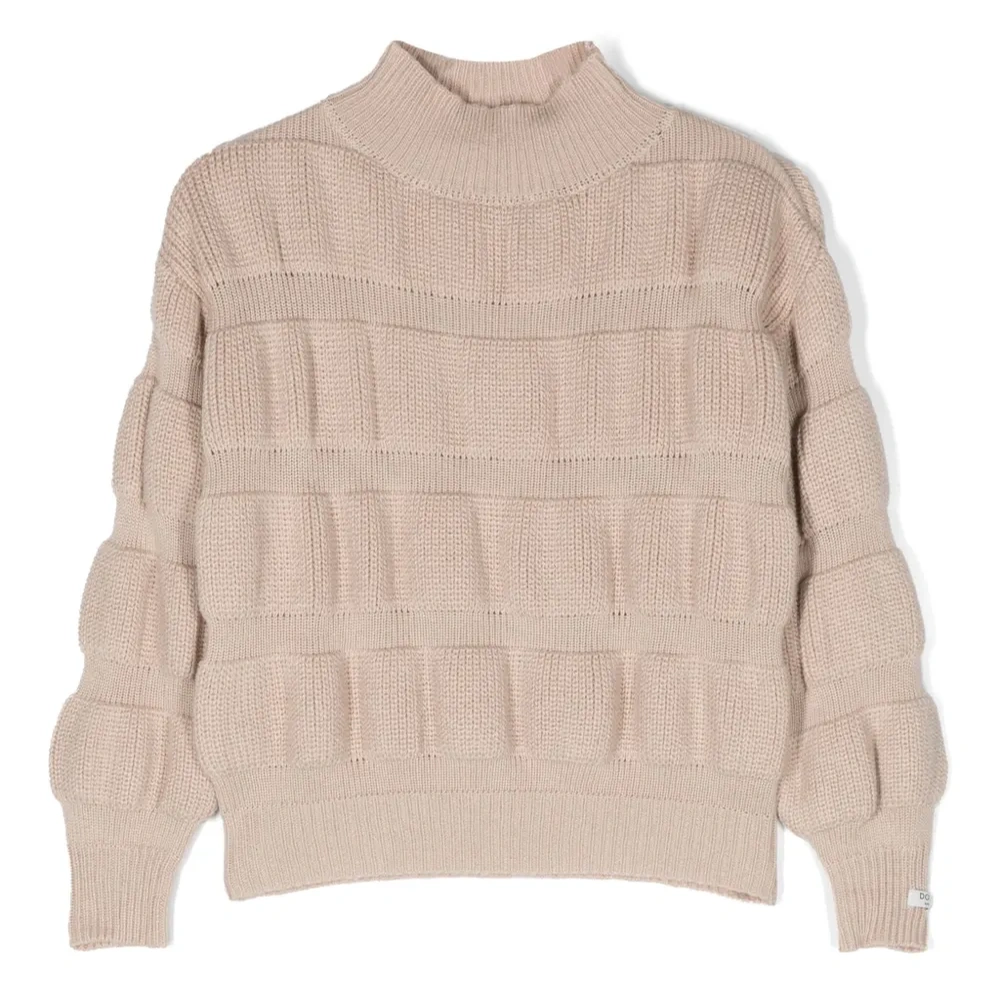 Песочно-коричневый, смесовая шерсть мериноса, тонкая вязка, высокий воротник, приспущенные плечи и длинные рукава.