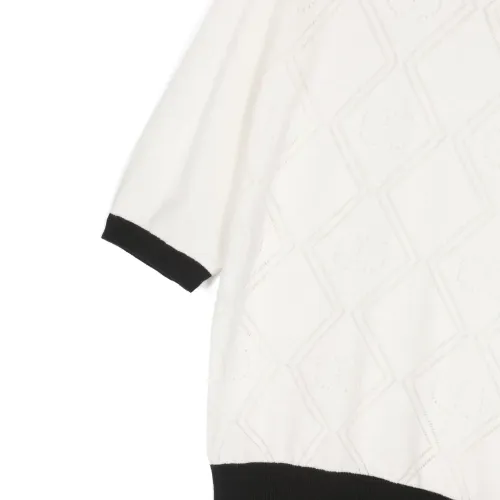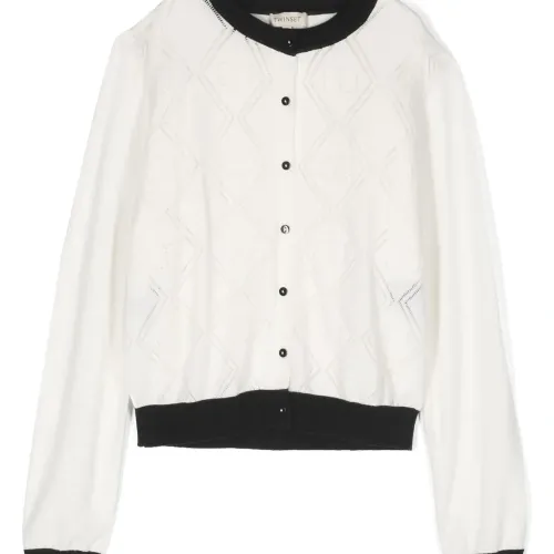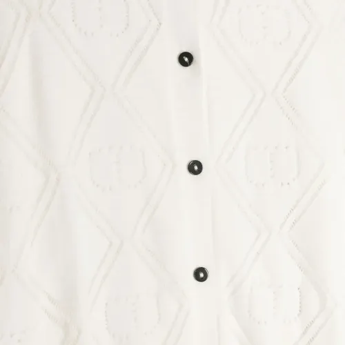 Белый, смесовая шерсть, жаккард с монограммой, круглый вырез, отделка в полоску, длинные рукава, застежка на пуговицах спереди, отделка в рубчик и прямой подол.