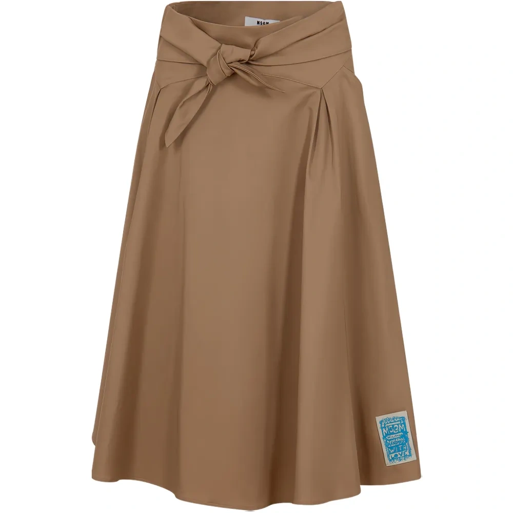 бежевое платье А-силуэта с узлом и нашивкой-логотипом