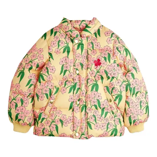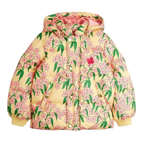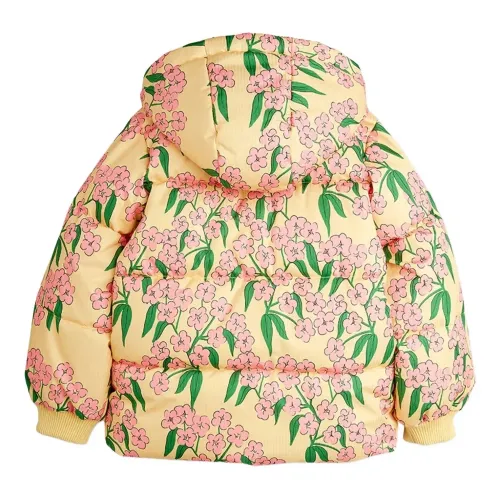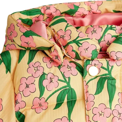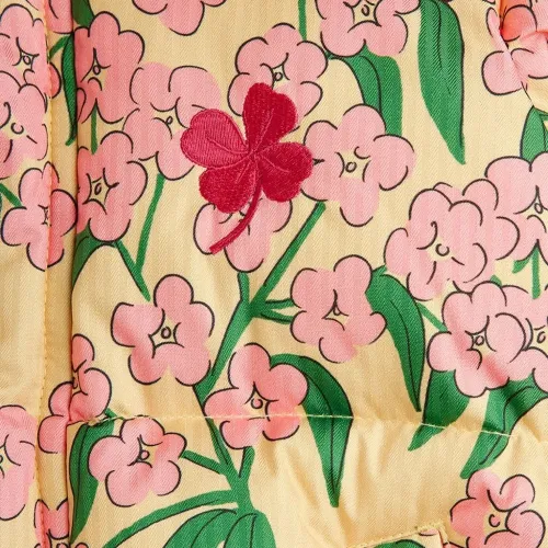 желтая куртка с цветочным принтом, капюшоном, застежкой на кнопки спереди, длинными рукавами и ребристыми манжетами