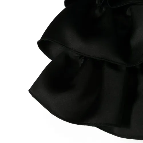 Черный, серебристый металлический логотип, вставки с оборками, эластичный пояс и прямой подол.