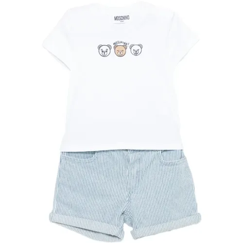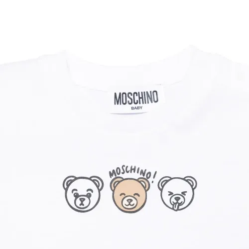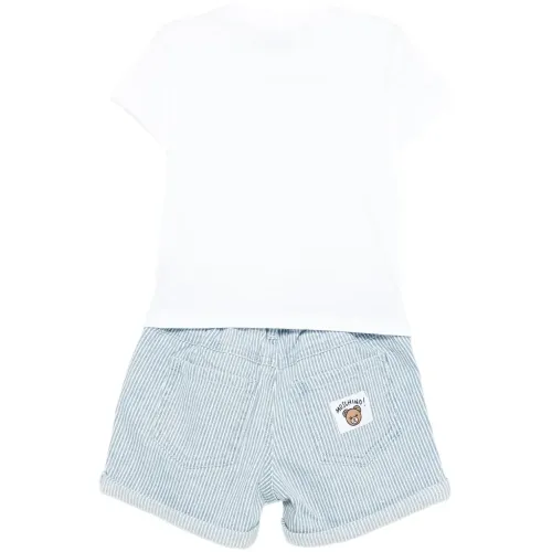 голубая и белая полосатая футболка с медвежонком, короткими рукавами и подворотами