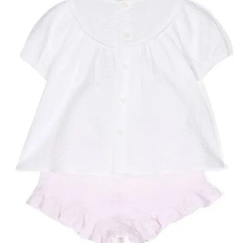 Белый, светло-розовый, эластичный хлопок, круглый вырез, застежка на пуговицы сзади, короткие рукава, прямой подол, отделка с оборками, эластичный пояс и модель без застежки.