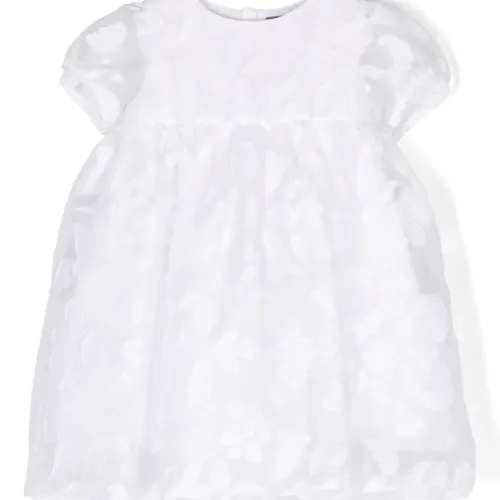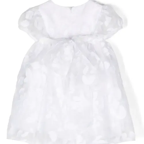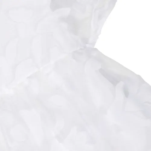 Белый, хлопок, сплошная цветочная вышивка, круглый вырез, короткие объемные рукава, завязка на бант сзади, потайная застежка на молнии сзади и расклешенный подол.