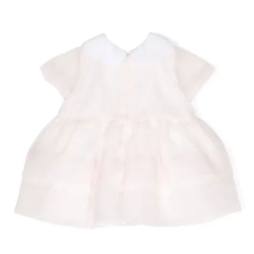 Светло-розовый, верхний слой из тюля, бант, манишка, без рукавов, потайная застежка на молнии сзади, эластичный пояс и прямой подол.