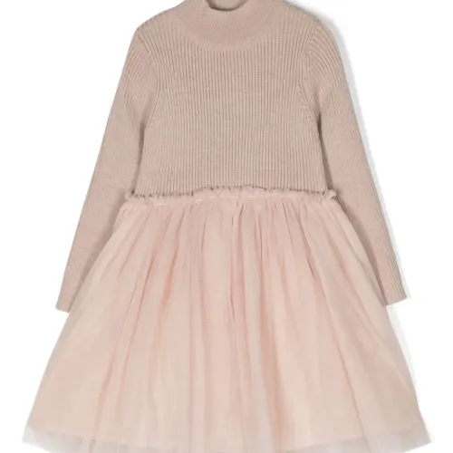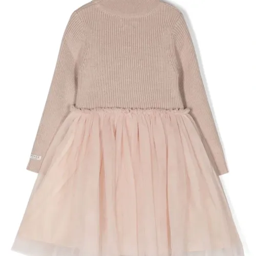 Бежевый, розовый, смесовая шерсть, круглый вырез, нашивка с логотипом на рукаве, длинные рукава, эластичный пояс и плиссированная юбка.
