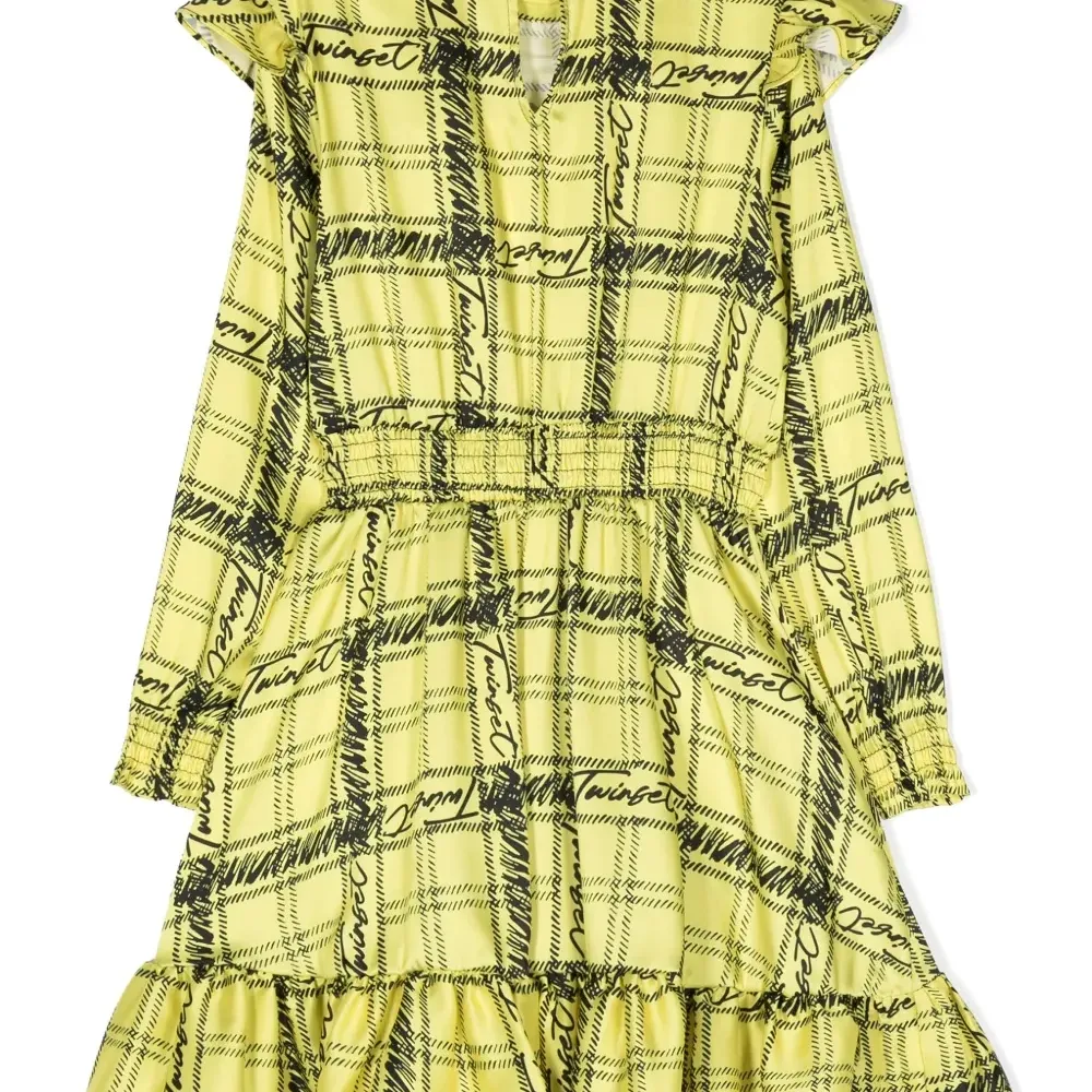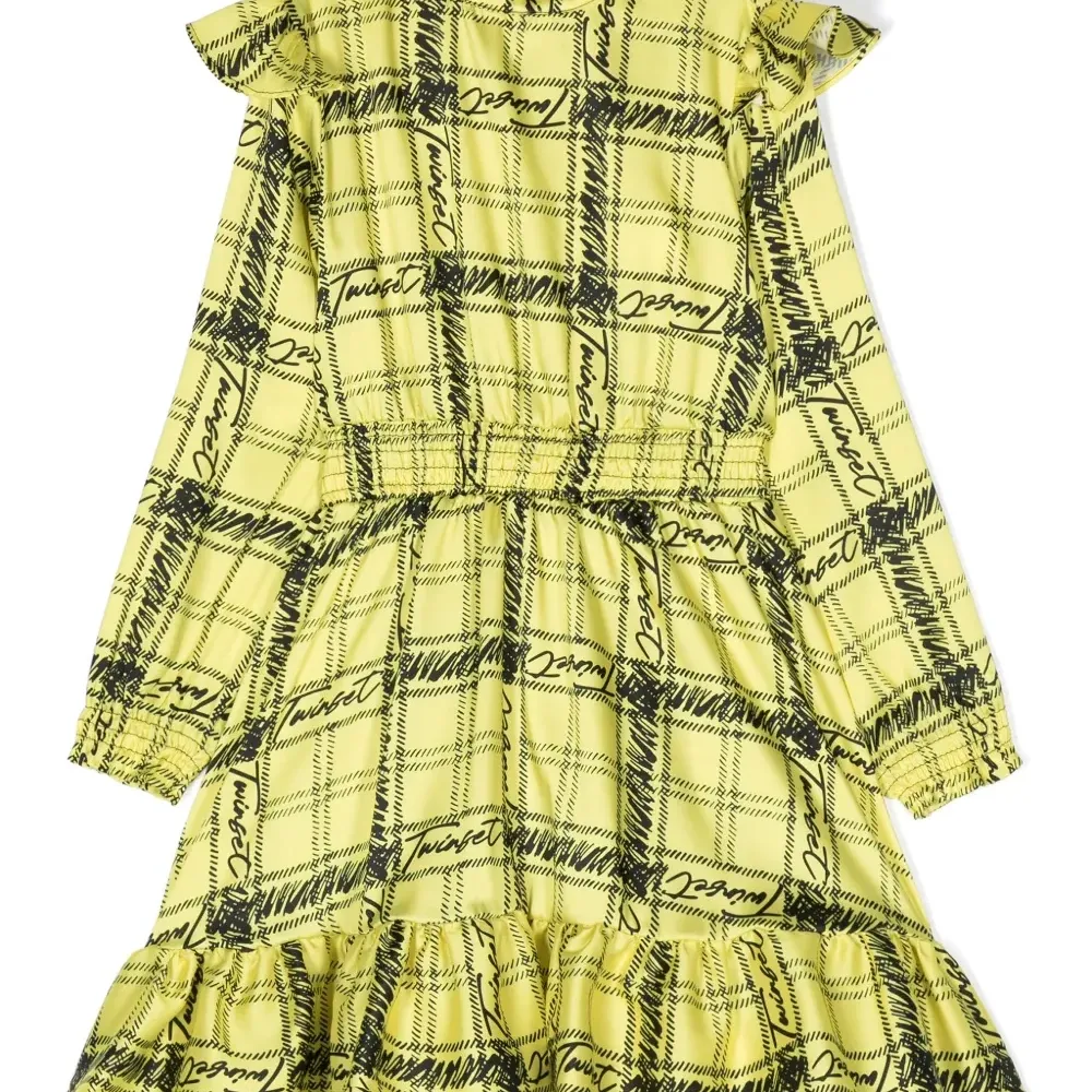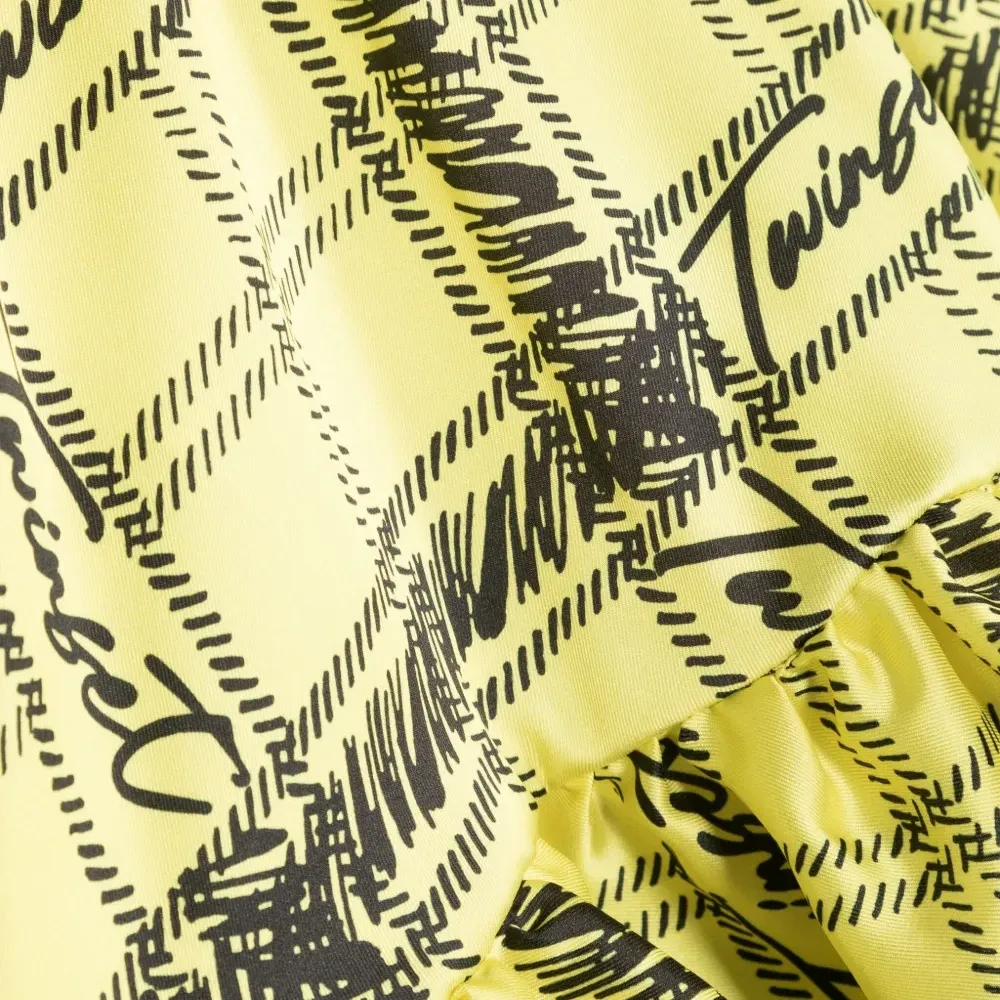 Желтый, черный, клетчатый узор, сплошной принт с логотипом, воротник со сборками, вставки с оборками, вырез сзади, эластичный пояс и необработанные края.