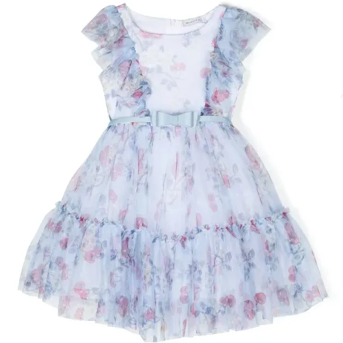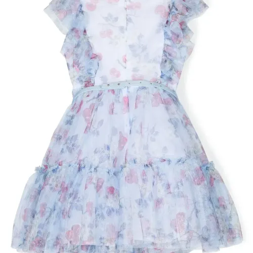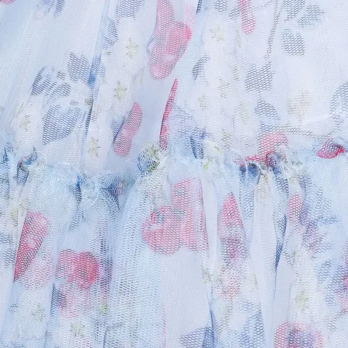 Голубой, смесовый хлопок, сплошной цветочный принт, бант, отделка с оборками, круглый вырез, потайная застежка на молнии сзади, без рукавов, ремень на талии и юбка А-образного силуэта.