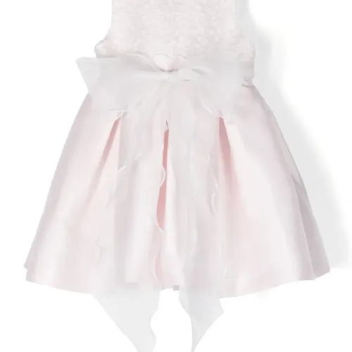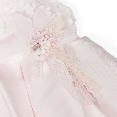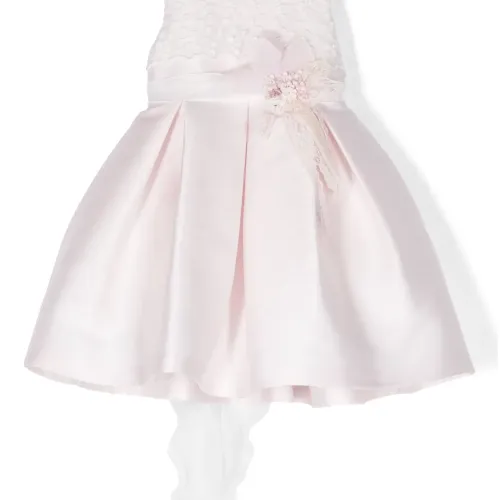 Пудрово-розовый, белый, смесовый хлопок, сатиновая фактура, цветочные вставки, аппликация из кружева с цветочным узором, круглый вырез, потайная застежка на молнии сзади, завязка на бант сзади, без рукавов, плиссированная юбка, ярусная юбка и цельная подкладка.