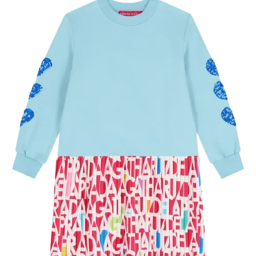 синяя плиссированная юбка с логотипом, длинными рукавами и круглым вырезом
