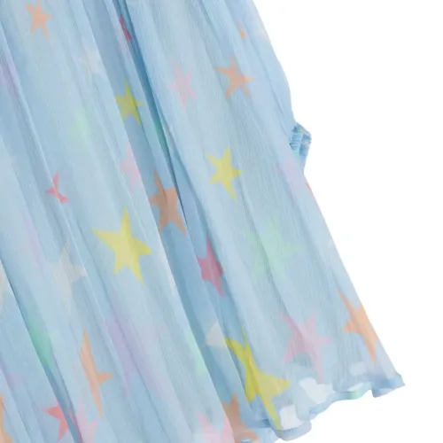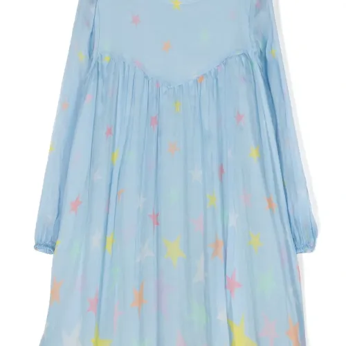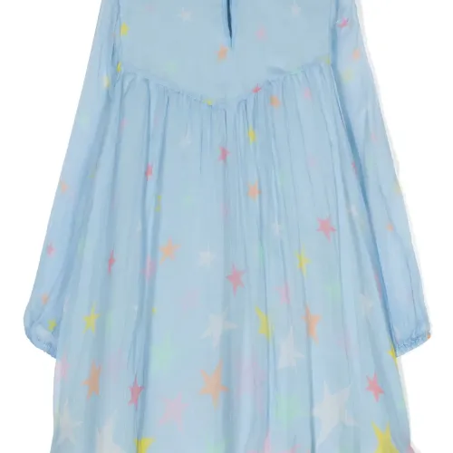Голубой, шелк, шифон, принт с изображением звезд, складки, круглый вырез, длинные рукава, эластичные манжеты, застежка на пуговицу сзади и расклешенный подол. Узнать больше о том, какие товары получают отметку «Ответственный выбор», можно из материала «Как мы оцениваем экологичность и этичность».