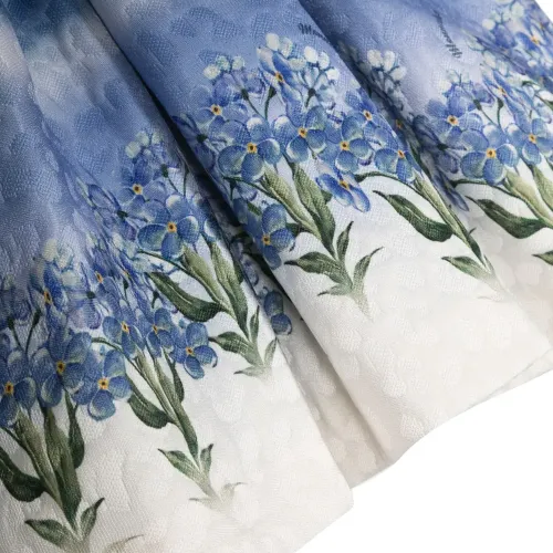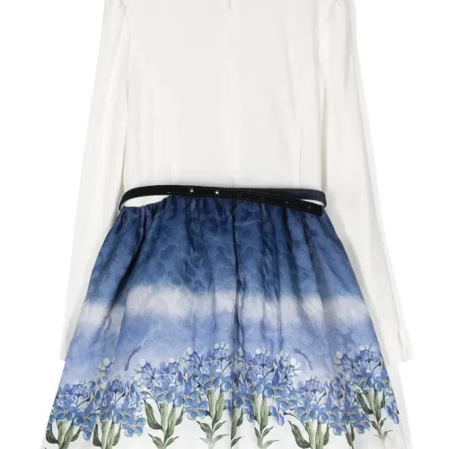 Белый/разноцветный, эластичный хлопок, цветочный принт на юбке, ремень на талии, бант, плиссированная юбка, воротник с оборками, длинные рукава, потайная застежка на молнии сзади и закругленный подол.