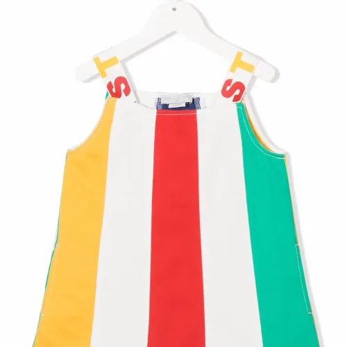 Силуэт «трапеция», принт в вертикальную полоску, два ремня на плечо с логотипом, круглый вырез, без рукавов и закругленный подол. .