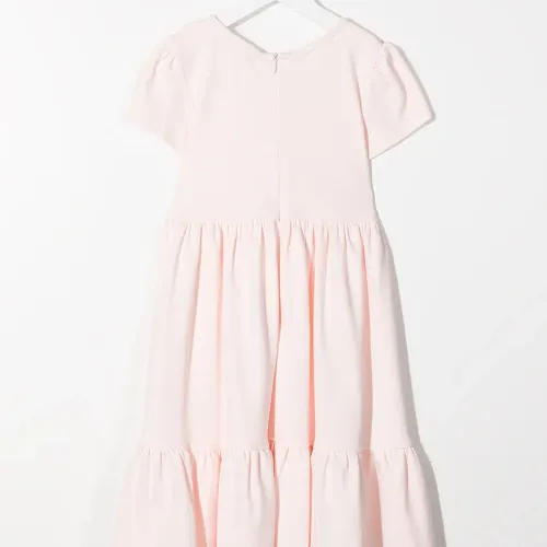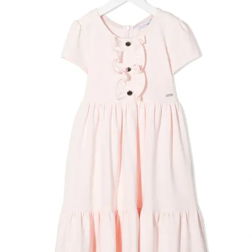 Отделка с оборками, декоративные пуговицы, круглый вырез, короткие рукава, ярусная юбка и отделка со сборками.