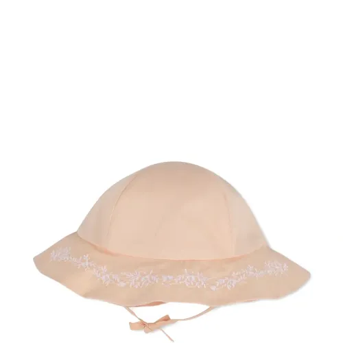 бежевое платье с цветочной вышивкой, квадратным вырезом и короткими пышными рукавами, в комплекте с шляпой