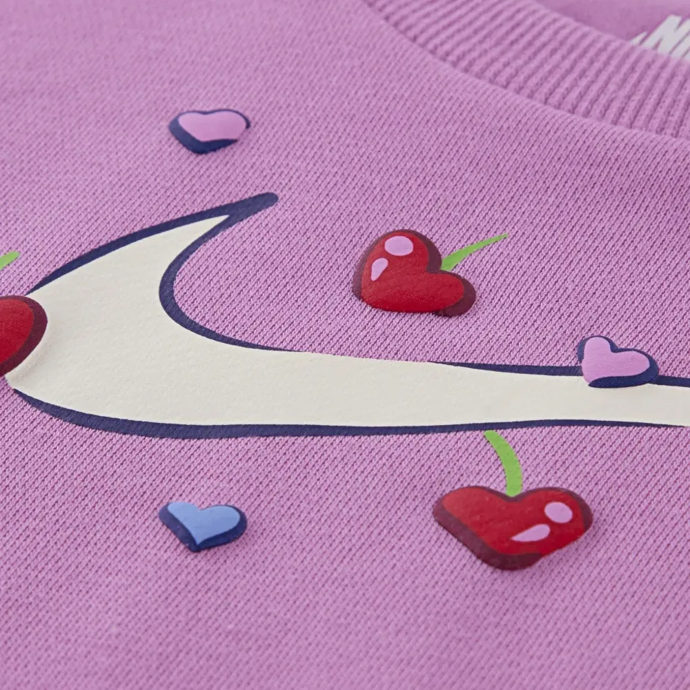 принт с вишнями розового и голубого цвета, принт с сердечками, расклешённые штанины, фирменная деталь с логотипом
