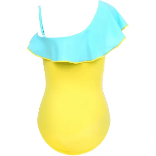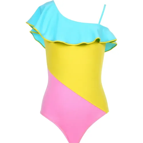жёлто-розово-голубой дизайн с цветными блоками, асимметричный вырез на одно плечо, одиночная бретель, отделка рюшами. Пожалуйста, примерьте купальник поверх собственного белья.