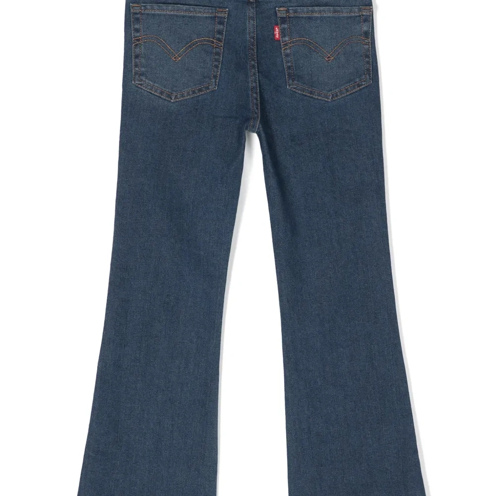 Синий, смесовый хлопок, обработанный деним, нашивка с логотипом сзади, средняя посадка, петли для ремня, декоративные складки, застежка на пуговицах спереди, пять карманов, прямой крой и прямой подол.