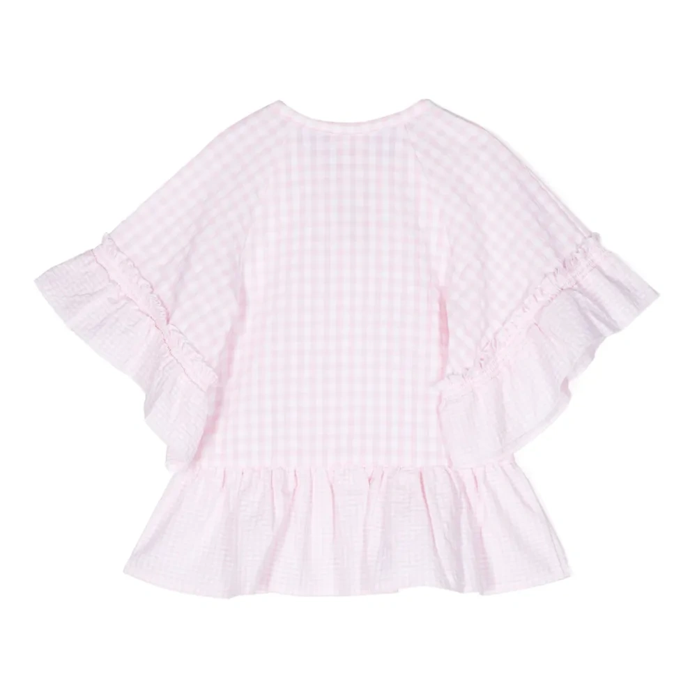 Белый, смесовый хлопок, клетчатый узор, воротник с кулиской, короткие рукава и подол с оборками.