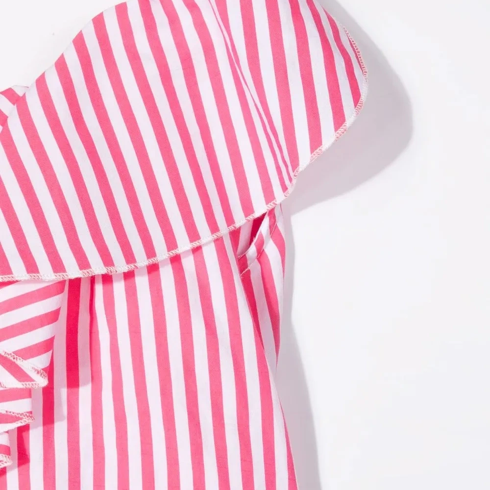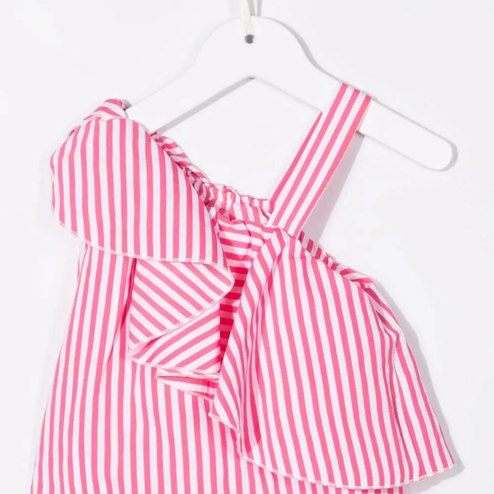 Вставки с оборками, узор в полоску, асимметричная юбка и V-образный вырез.