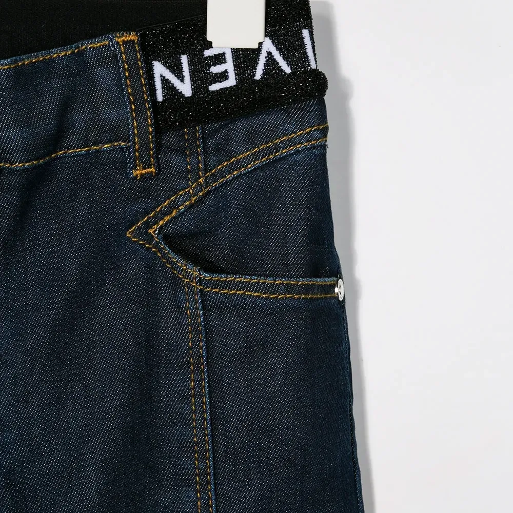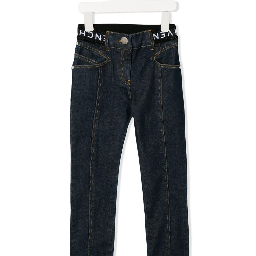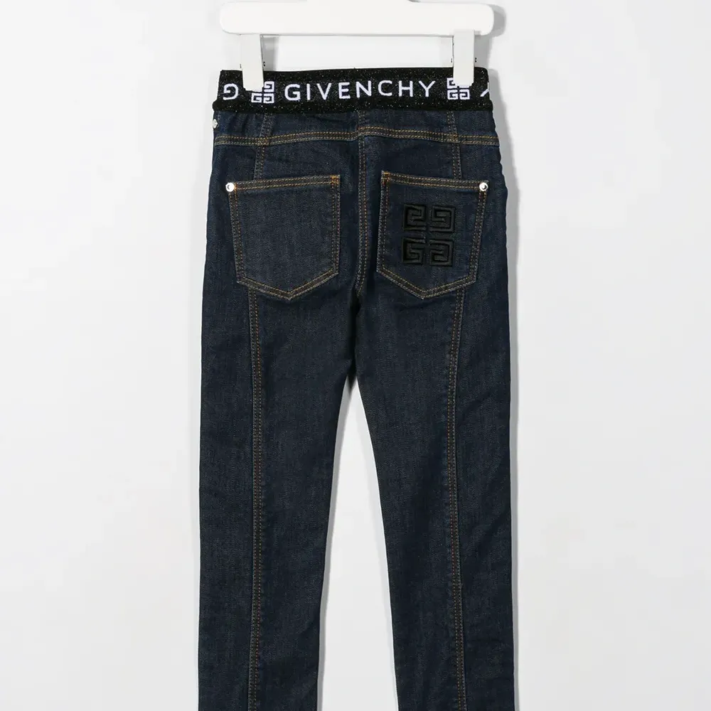 Джинсы с логотипом на поясе от Givenchy Kids. Эластичный пояс, модель без застежки, классическая пятикарманная модель, вышитый логотип сзади и прямые брючины.