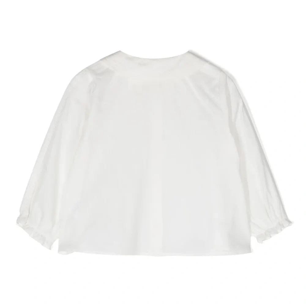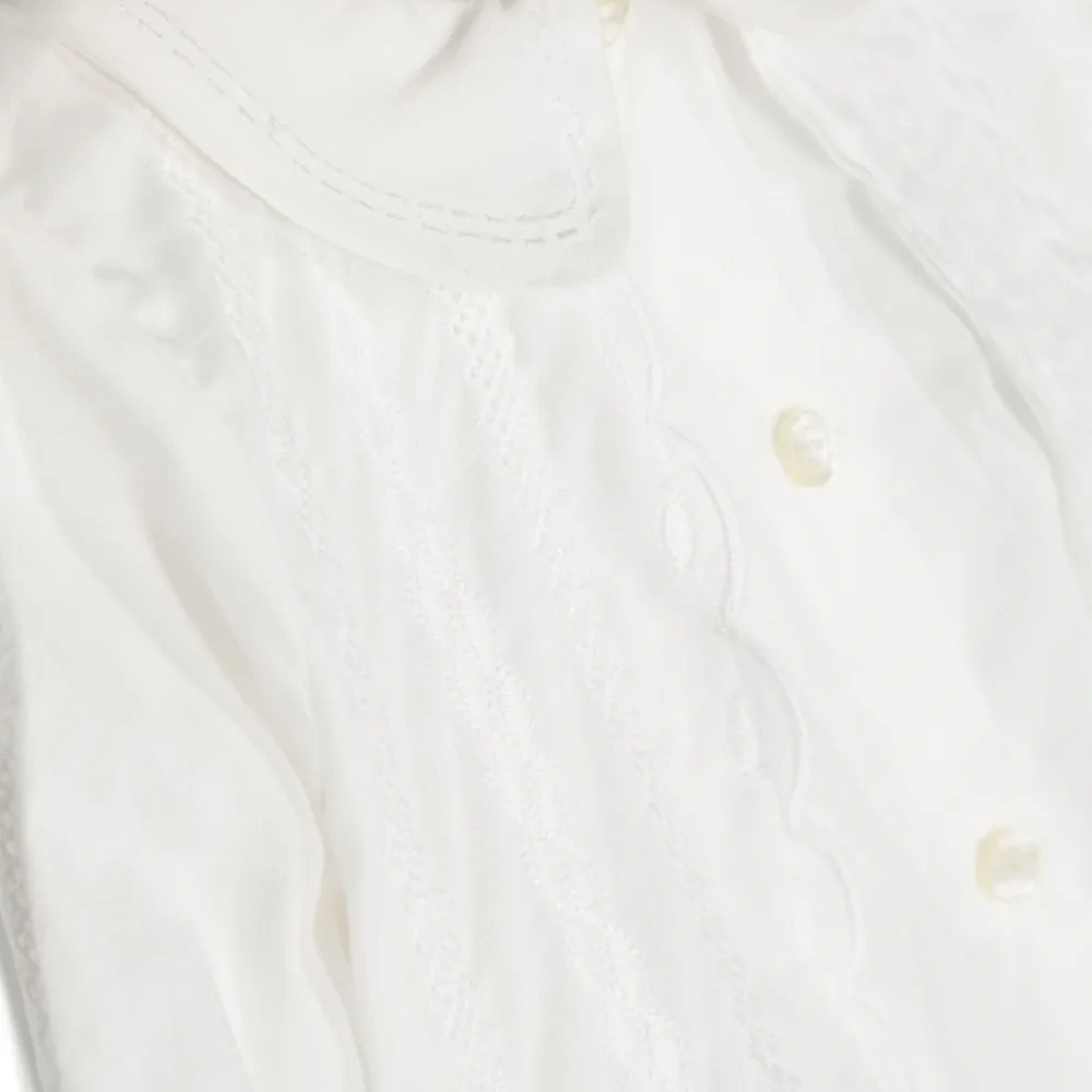 Экрю, хлопок, английская вышивка, строчка в тон, воротник Питер Пэн, застежка на пуговицах спереди, расклешенные рукава и расклешенный подол.