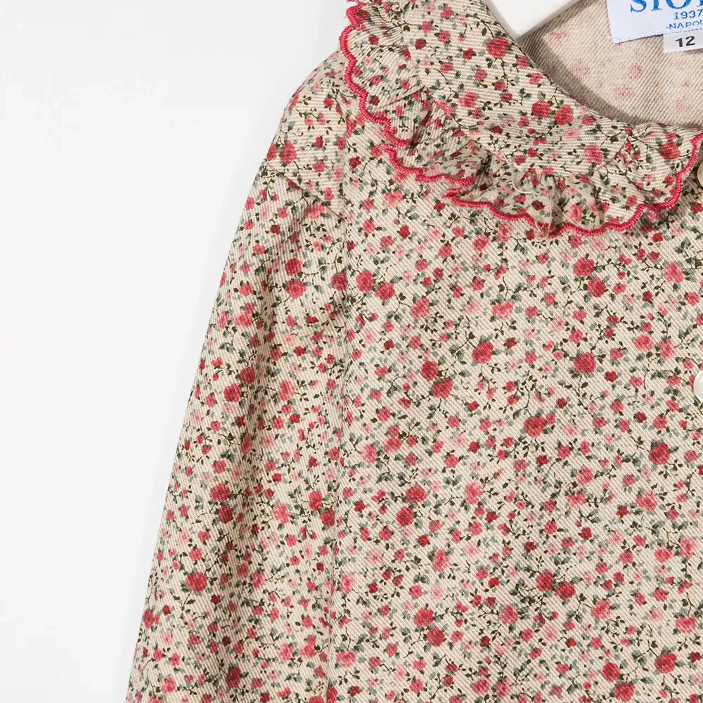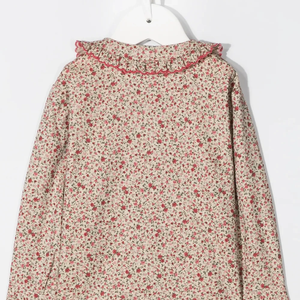 Цветочный принт, вставки с оборками, воротник Питер Пэн, длинные рукава, застежка на пуговицах спереди и прямой подол.