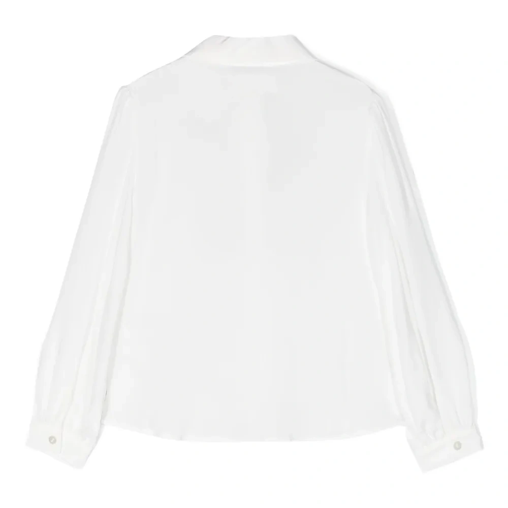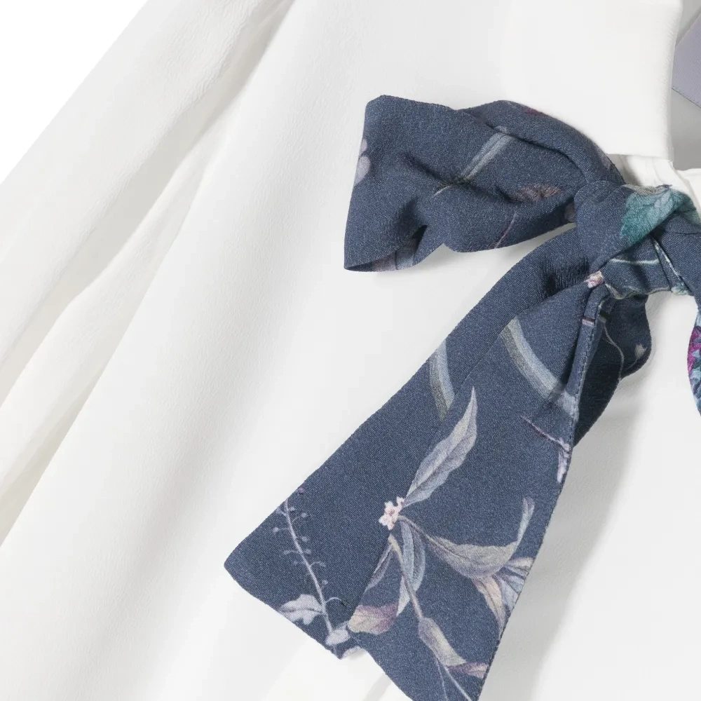 Белый, полупрозрачный дизайн, цветочный принт, завязка на бант, потайная пуговичная застежка спереди, длинные рукава, манжеты на пуговицах и закругленный подол.