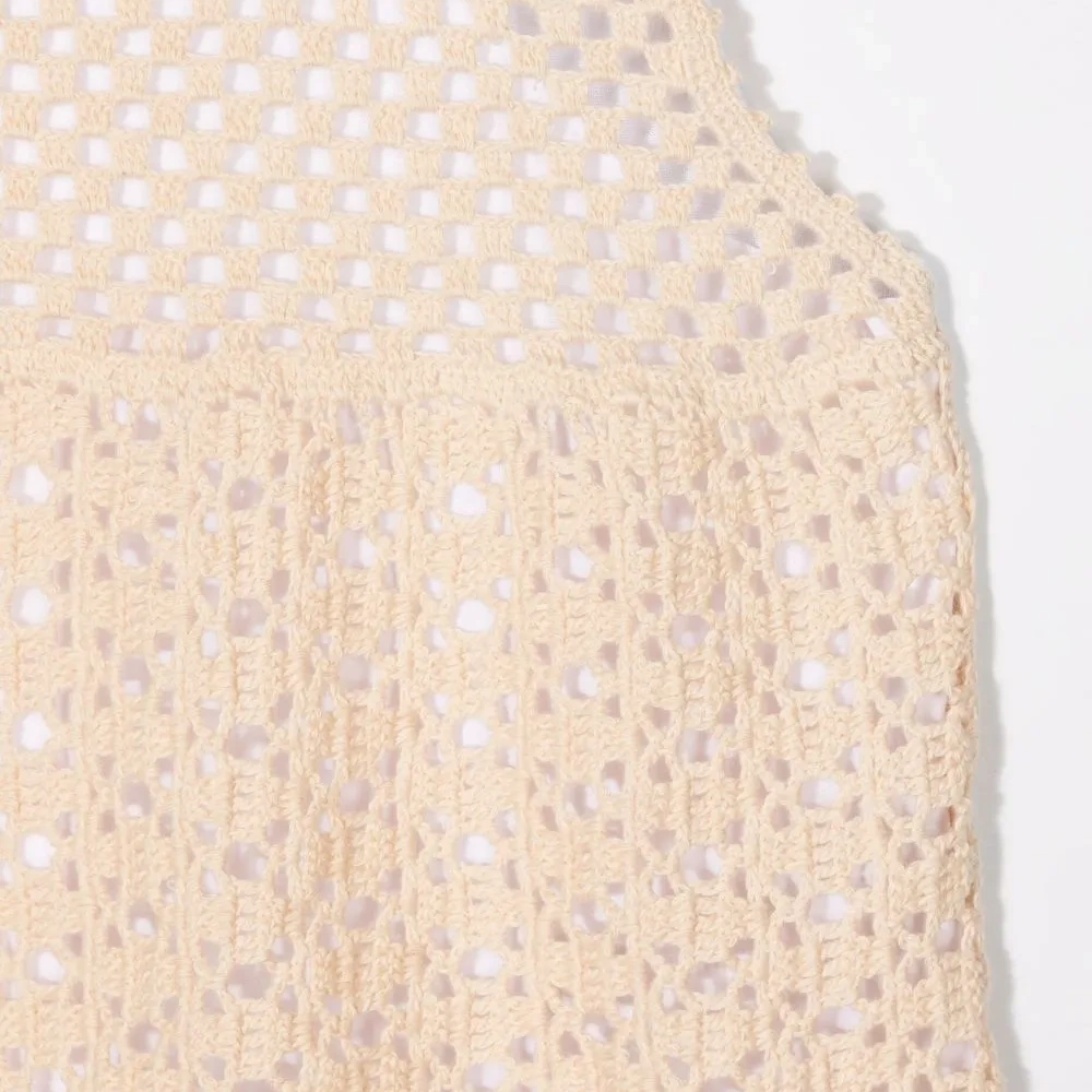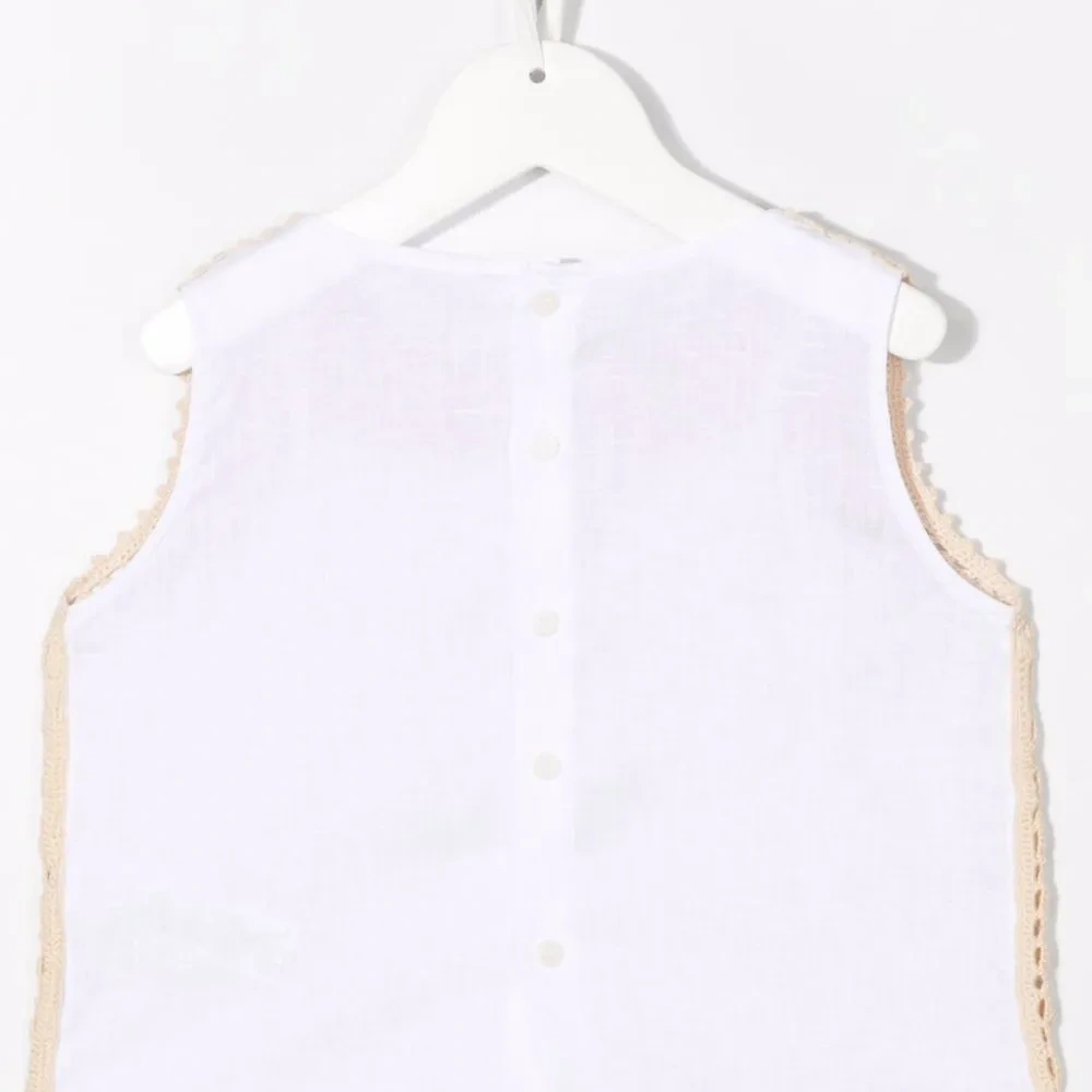 Отделка в технике макраме, круглый вырез, без рукавов и застежка на пуговицы сзади.