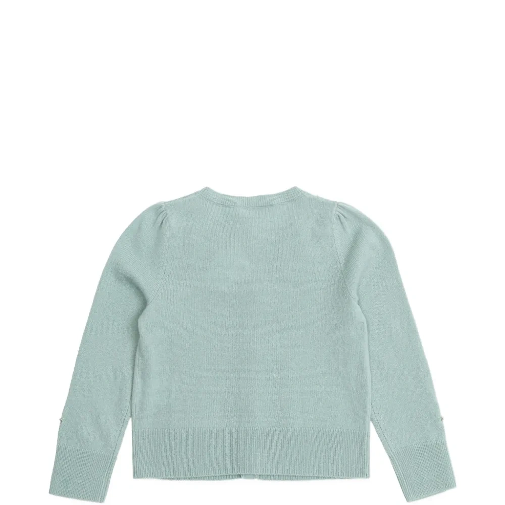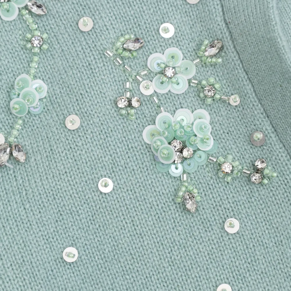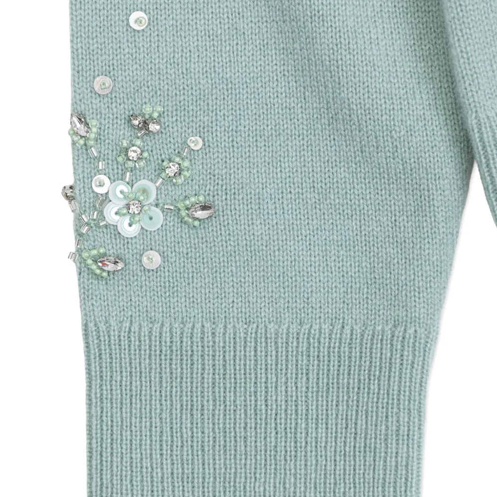 светло-голубой с цветочными деталями, украшением из пайеток, круглым вырезом, длинными рукавами, застёжкой на пуговицы спереди