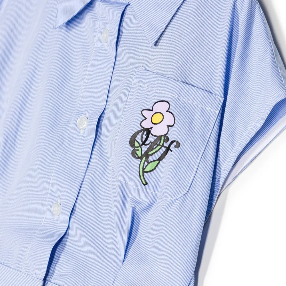 Голубой, белый, хлопок, вышивка, прямой воротник, застежка на пуговицах спереди, короткие рукава, нагрудный накладной карман и прямой подол.