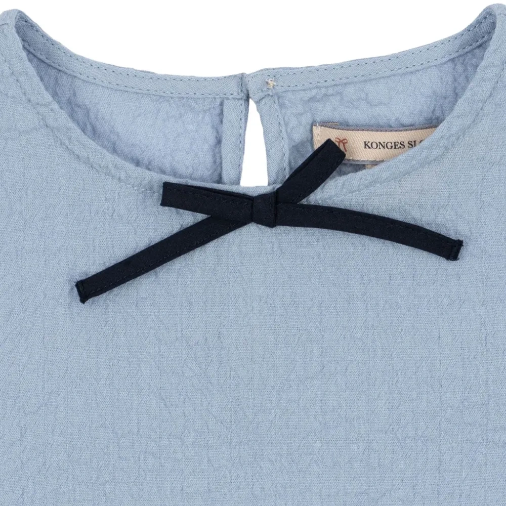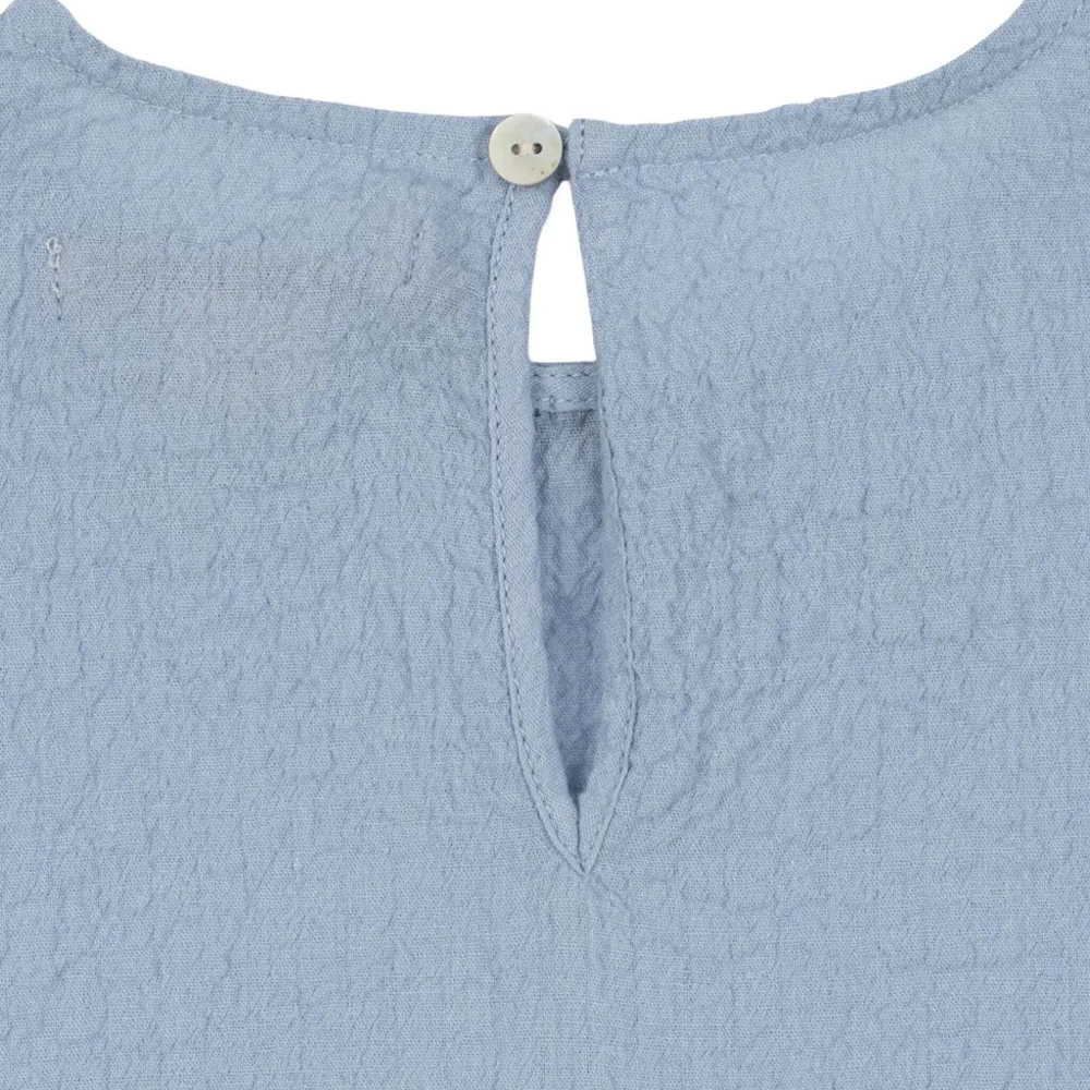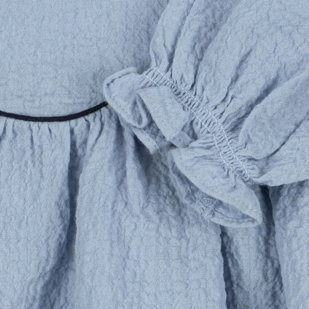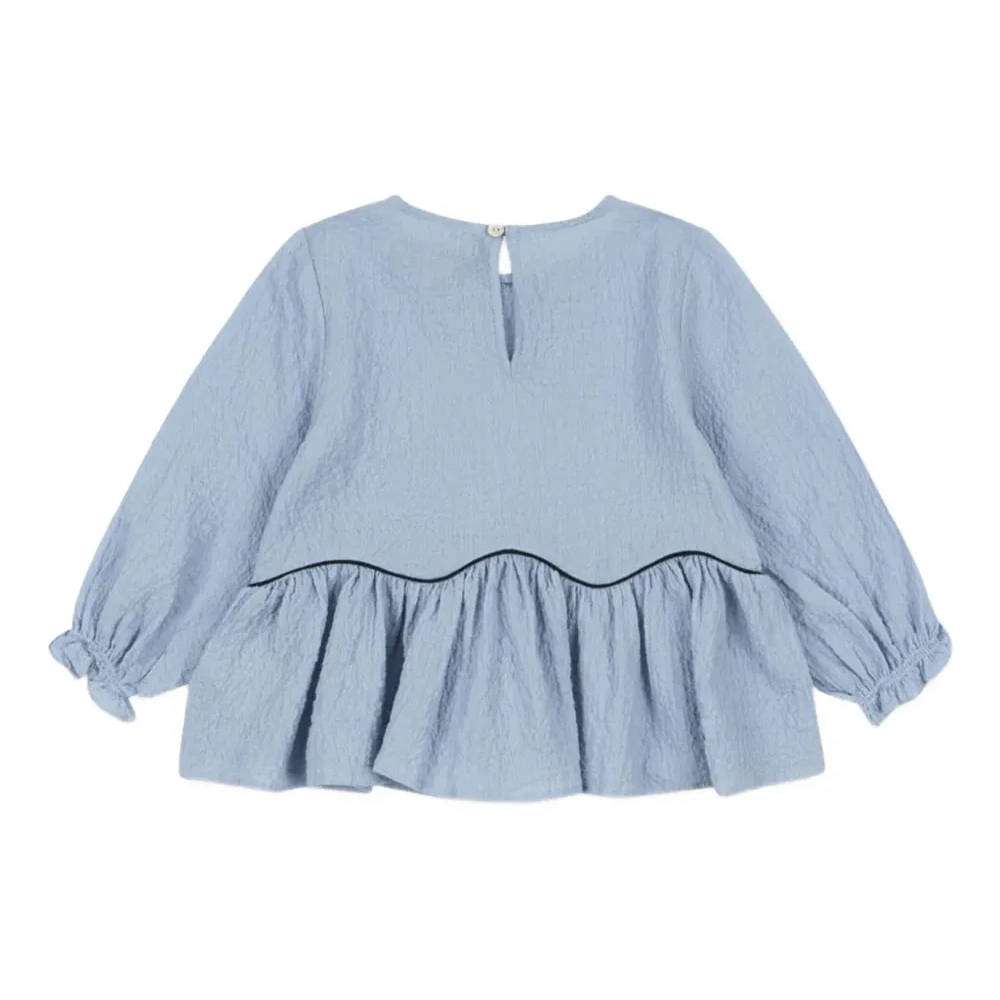 светло-голубой топ с текстурным плетением, бантом, воланами по подолу, длинными рукавами и застежкой на пуговицы сзади