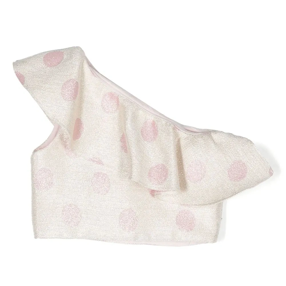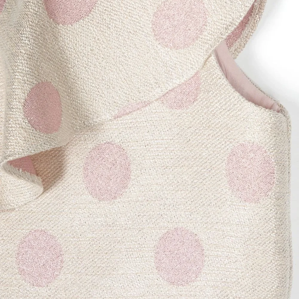 Кремово-белый, светло-розовый, хлопок, смесовый хлопок, вставки из люрекса, принт в горох, модель на одном плече, вставки с оборками и без рукавов.