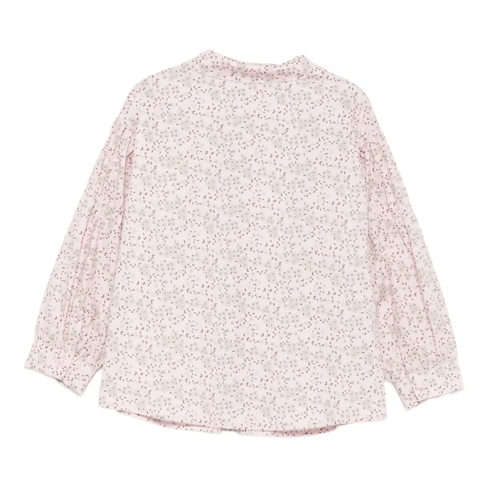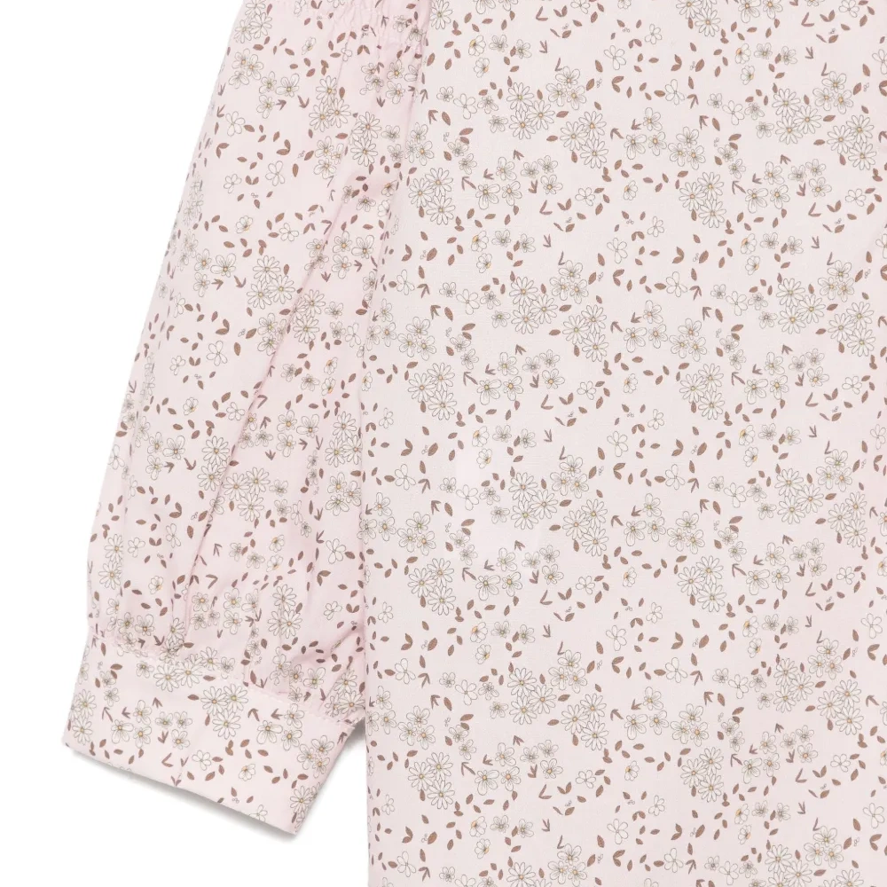 розовая рубашка с цветочным принтом, застёжкой на пуговицы, воротником, длинными рукавами и манжетами на пуговицах