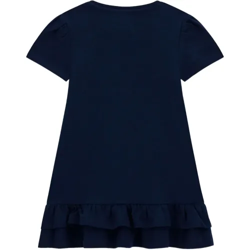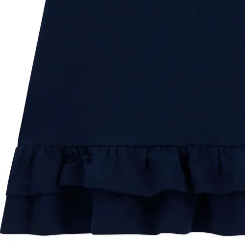 темно-синий цвет, принт с логотипом, блестящие детали, круглый вырез, короткие рукава, оборчатый низ