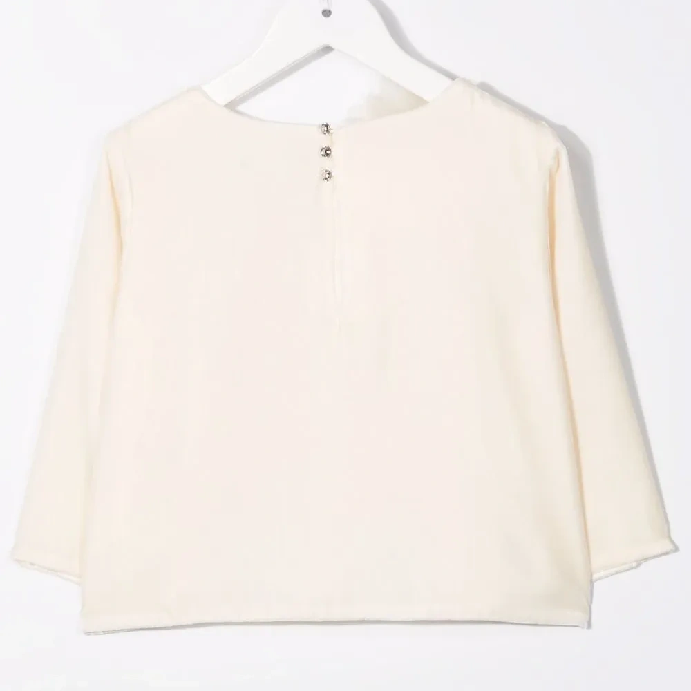 Круглый вырез, застежка на пуговицы сзади, длинные рукава, бант и прямой подол.