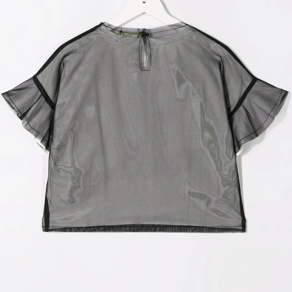Топ из тюля с графичным принтом от Andorine. Круглый вырез, рукава с воланами, панели из тюля и графический принт.