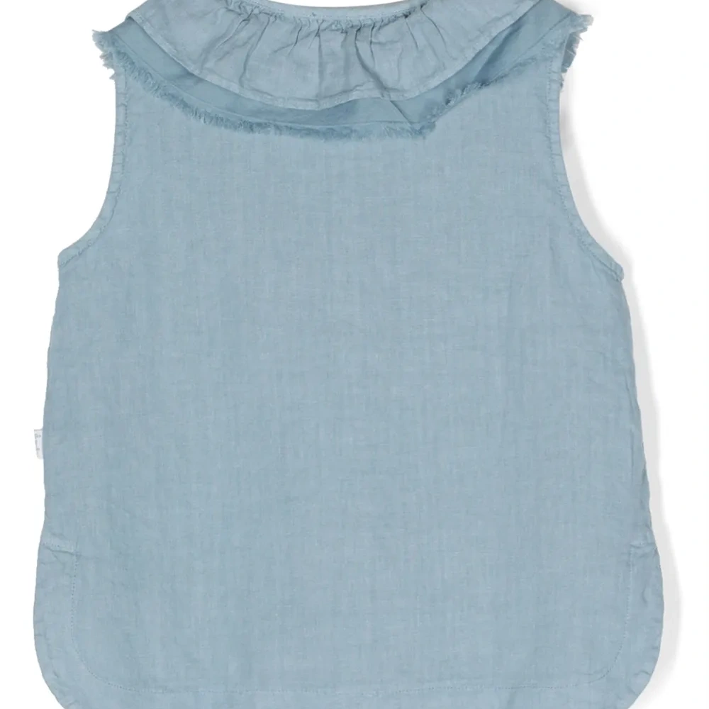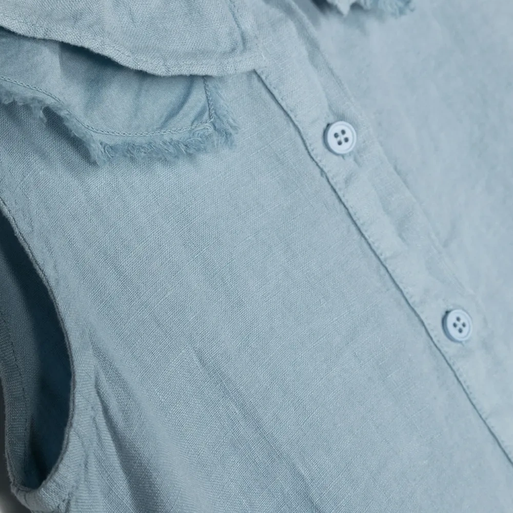 Синий, хлопок/лен, бахрома, воротник Питер Пэн, застежка на пуговицах спереди, без рукавов и закругленный подол.