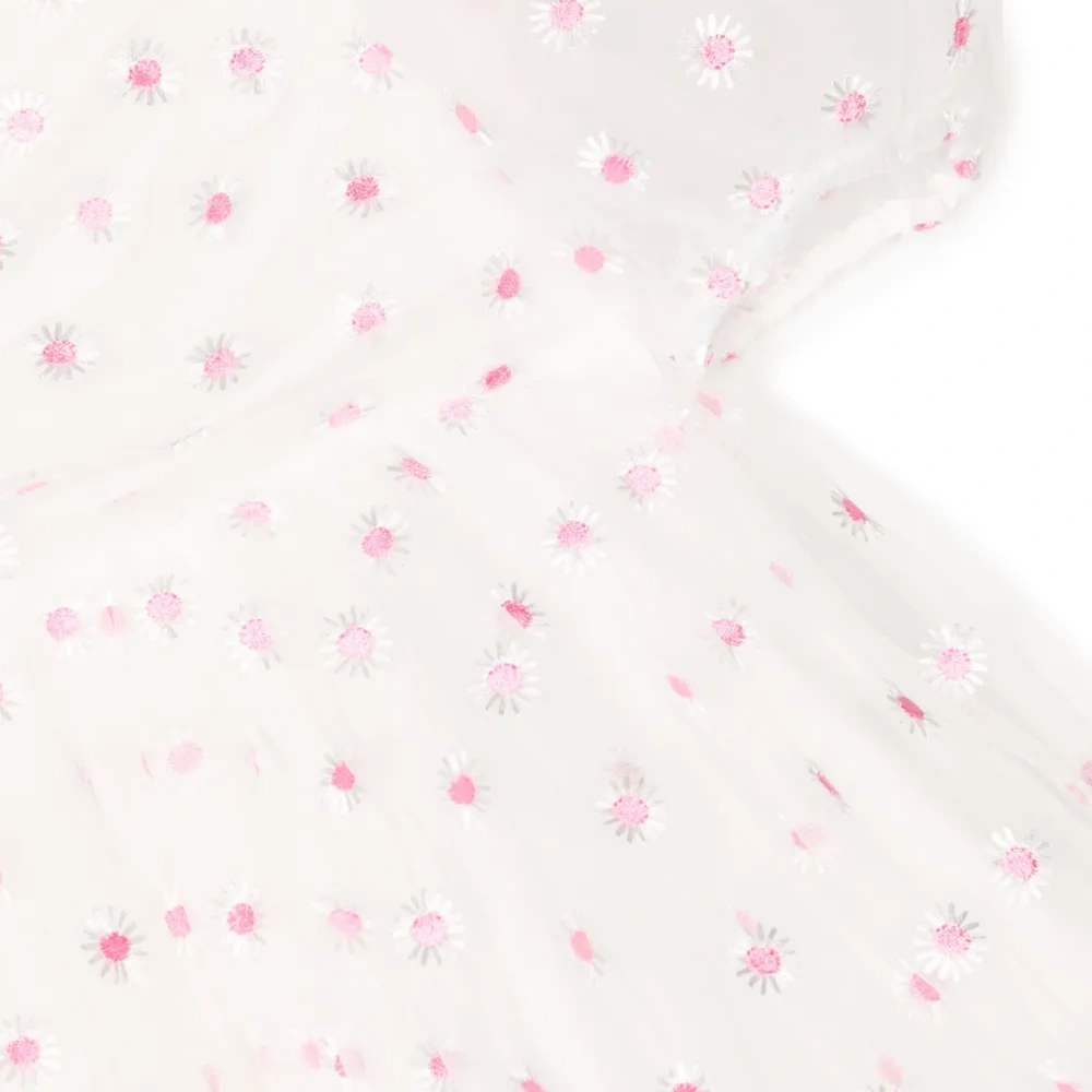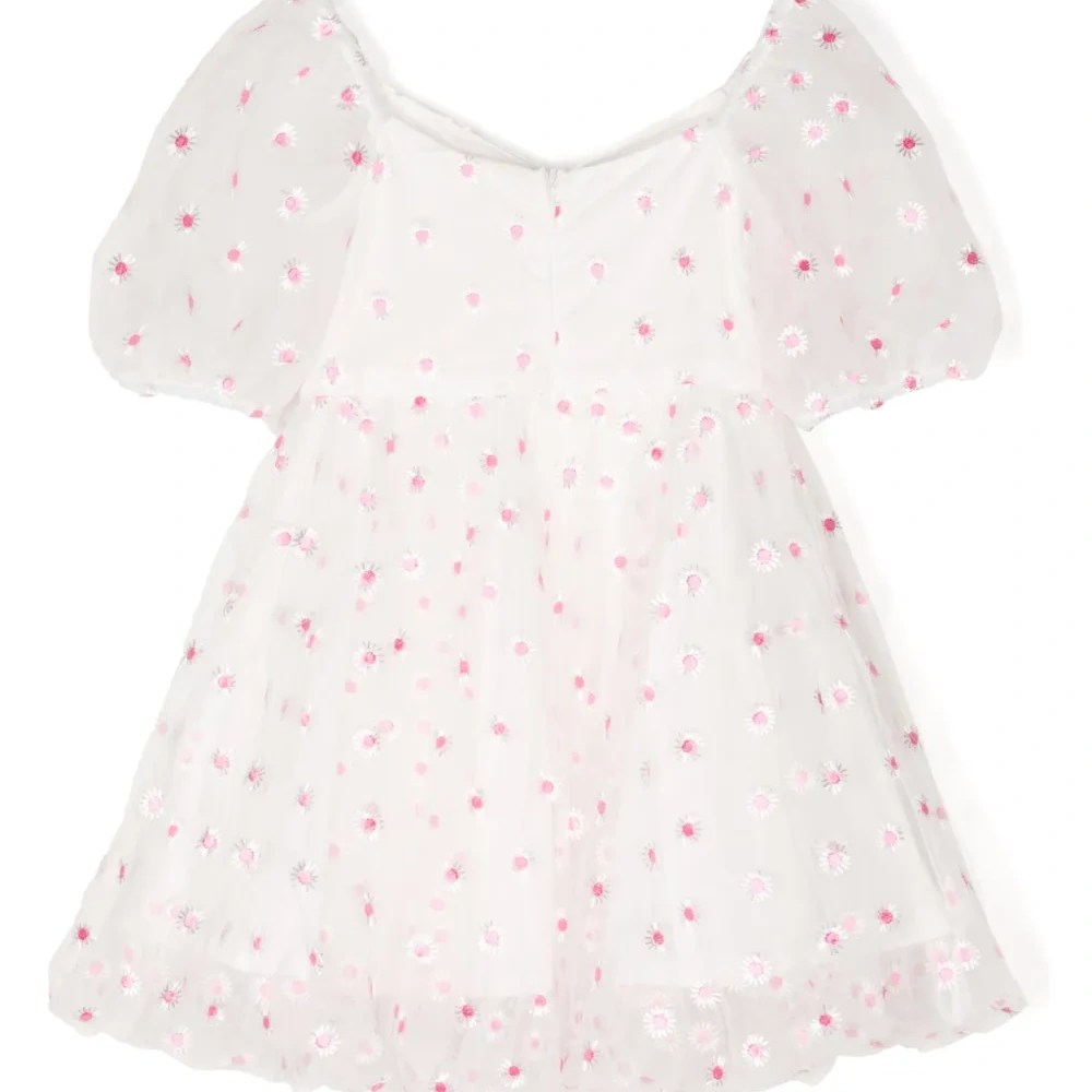 Цвет слоновой кости, вставки из тюля, сплошной цветочный принт, круглый вырез, застежка на молнии сзади, короткие объемные рукава и расклешенный подол.