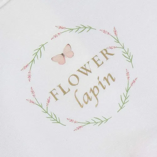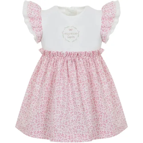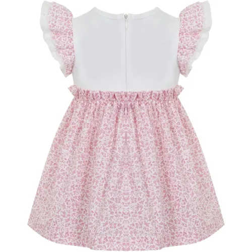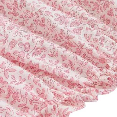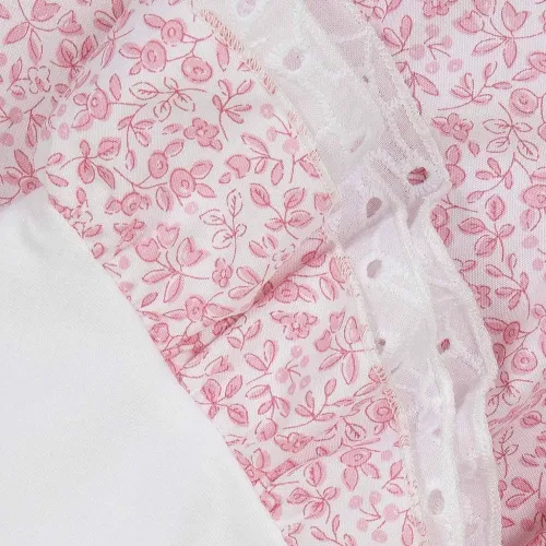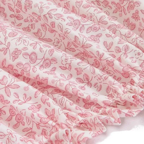 белое и розовое платье с цветочным принтом, оборками, короткими рукавами, круглым вырезом и эластичной талией