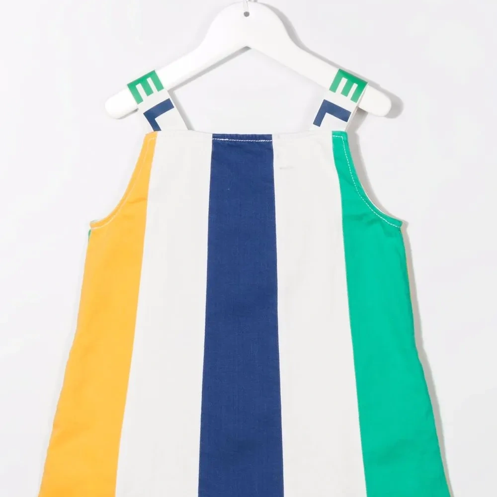 Силуэт «трапеция», принт в вертикальную полоску, два ремня на плечо с логотипом, круглый вырез, без рукавов и закругленный подол. .