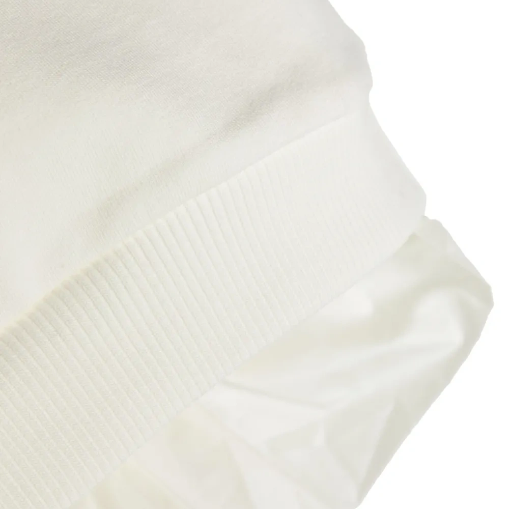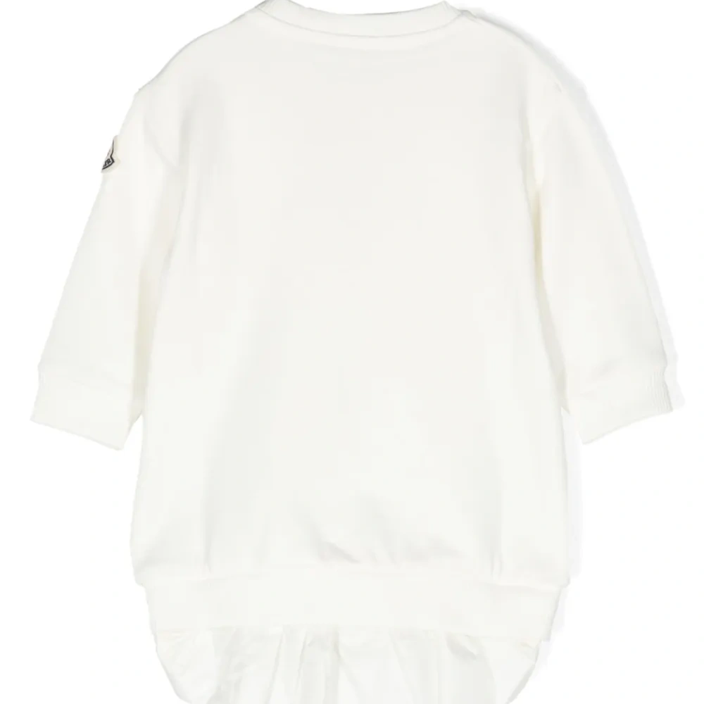 Белый, смесовый хлопок, многослойный дизайн, вышитый логотип спереди, круглый вырез, застежка на кнопках на плече, длинные рукава и закругленный подол.