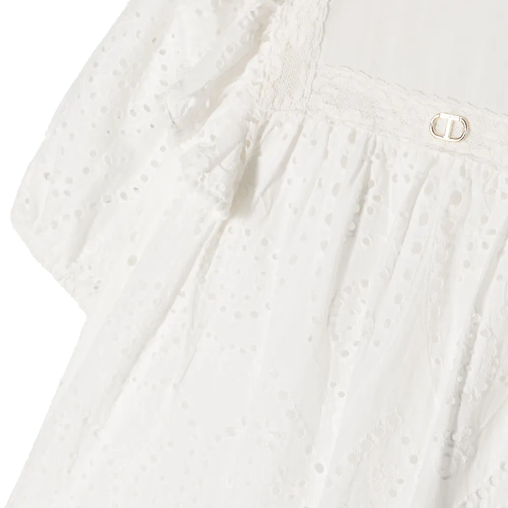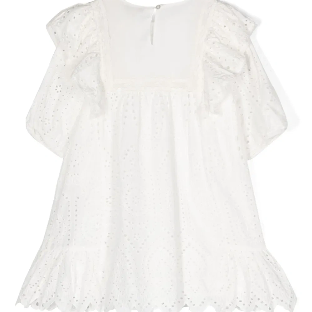 Белый, хлопок, английская вышивка, золотистый металлический логотип, вставки с оборками, вставки из кружева с узором, ампирный силуэт, круглый вырез, застежка на пуговицы сзади, длинные рукава, эластичные манжеты и подол с фестонами.