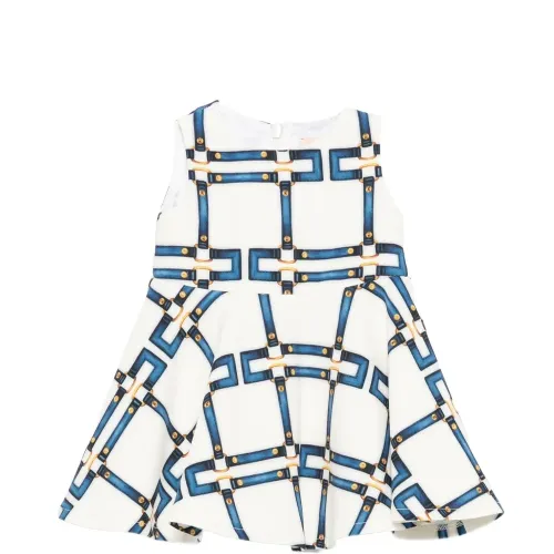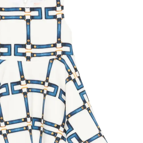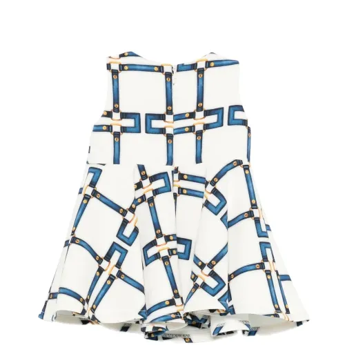 белый геометрический принт, заклёпки золотистого цвета, круглый вырез, без рукавов, застёжка-молния сзади
