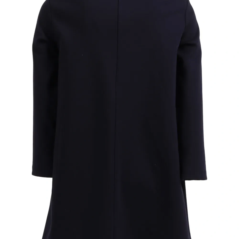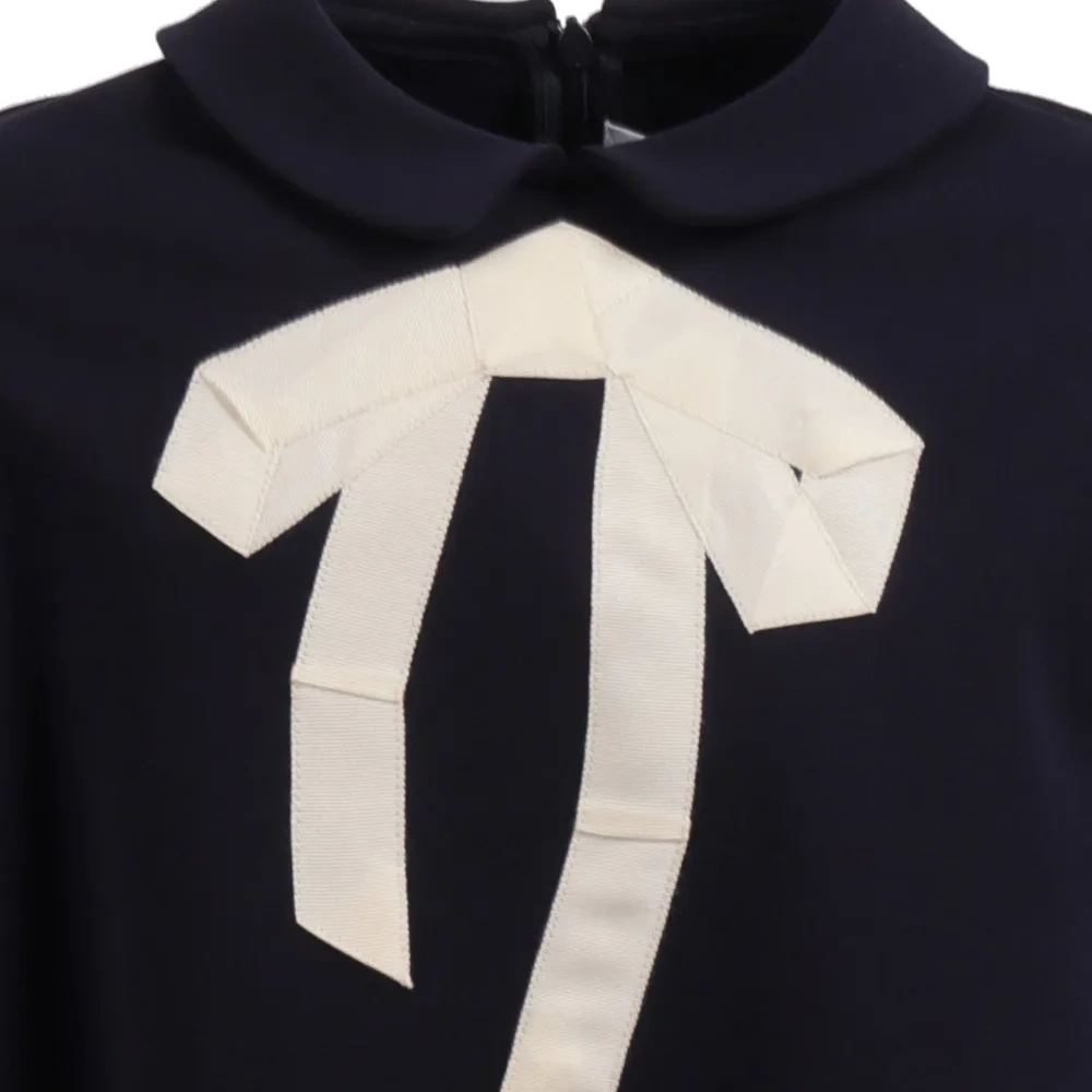 темно-синяя блузка с бантом, длинными рукавами, круглым воротником и застежкой-молнией сзади