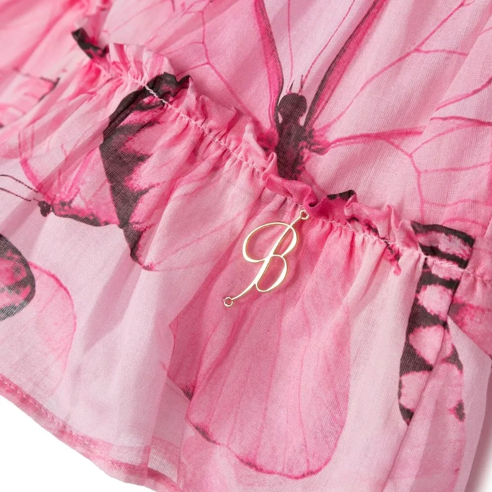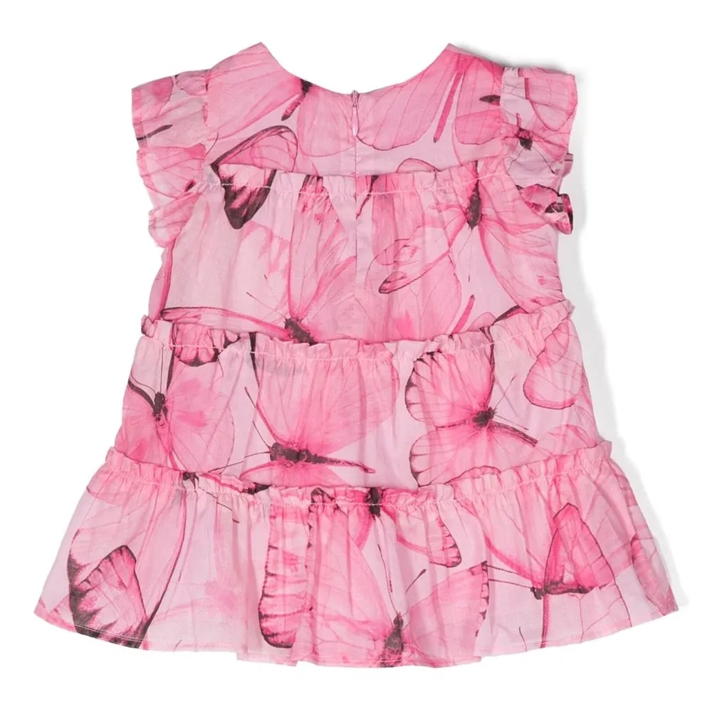 Розовый, хлопок, принт с изображением бабочки, логотип, вставки с оборками, круглый вырез, застежка на молнии сзади, манжеты с оборками и ярусная юбка.