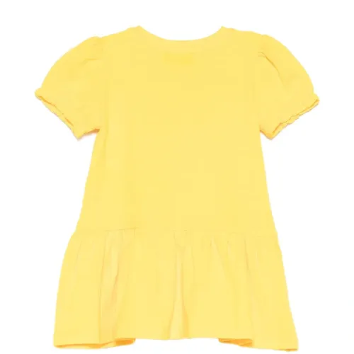 жёлтая футболка с графическим принтом, круглым вырезом, короткими пышными рукавами и эластичными манжетами