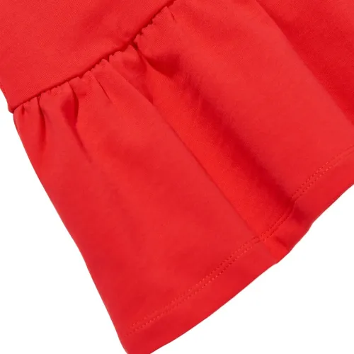 красная футболка с круглым вырезом, короткими рукавами, графическим принтом и оборчатым подолом